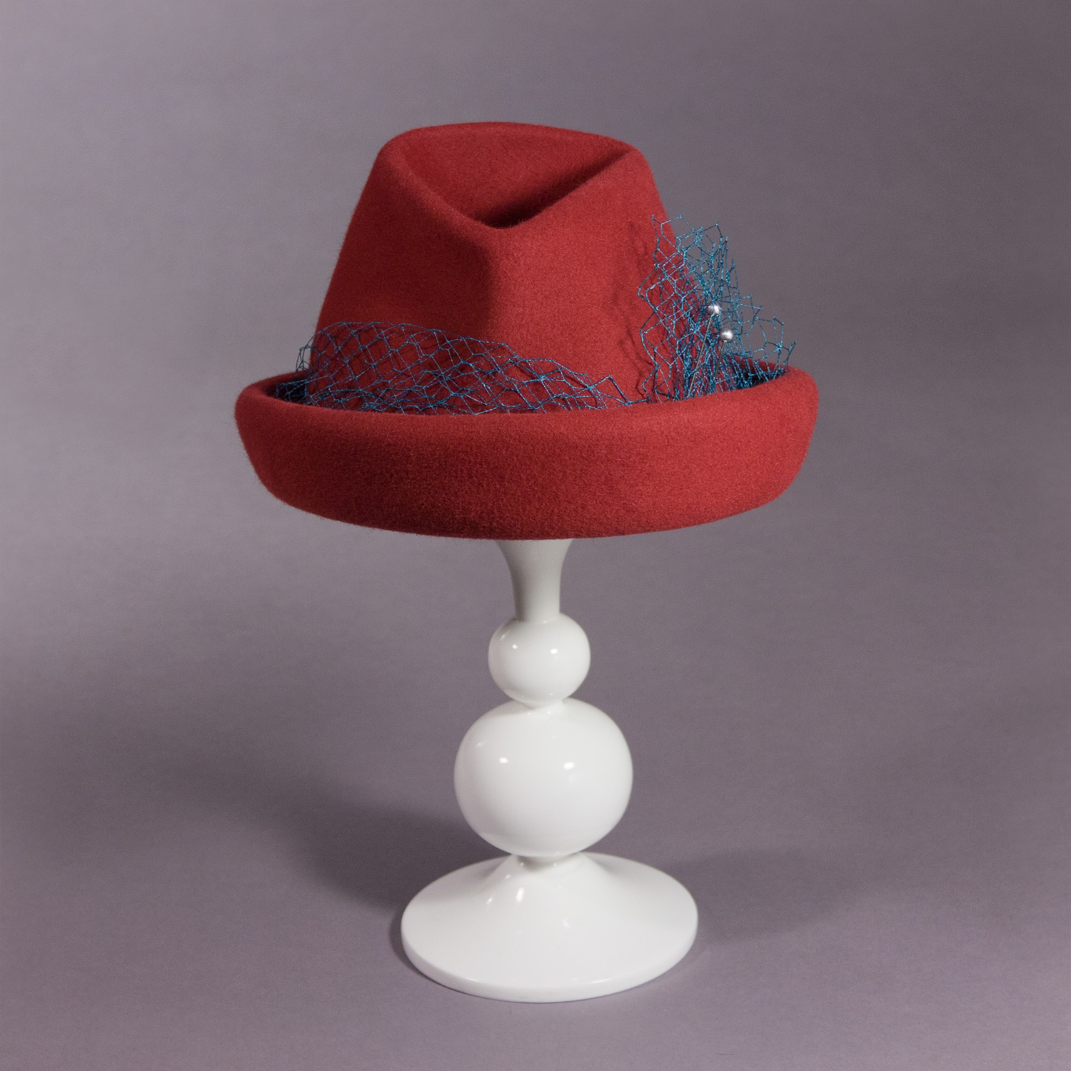 The 'Pixel' is a cute 1950s-inspired style, similar to the Pixie hats that were popular at the time. This hat is made from fur felt and vintage veiling, with a
